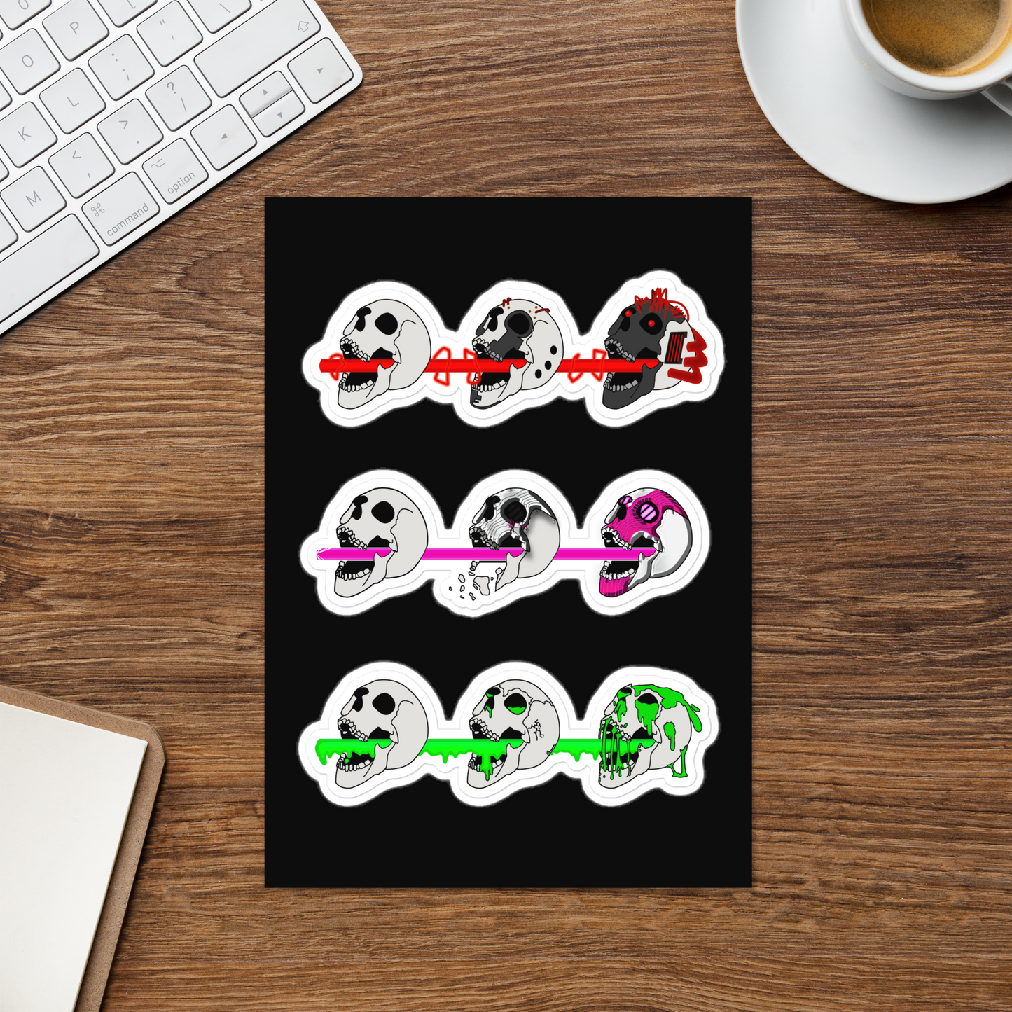 Take the technicolor wonder of dystopian death-omen on the go with this colorful all-in-one sticker sheet! Valued at just over $2 a sticker, this sticker sheet not only saves you a couple bucks on what would have been a more expensive per-sticker listing, but a great way to bring the style of the epic Triple Terminus series into your life without breaking the bank!
